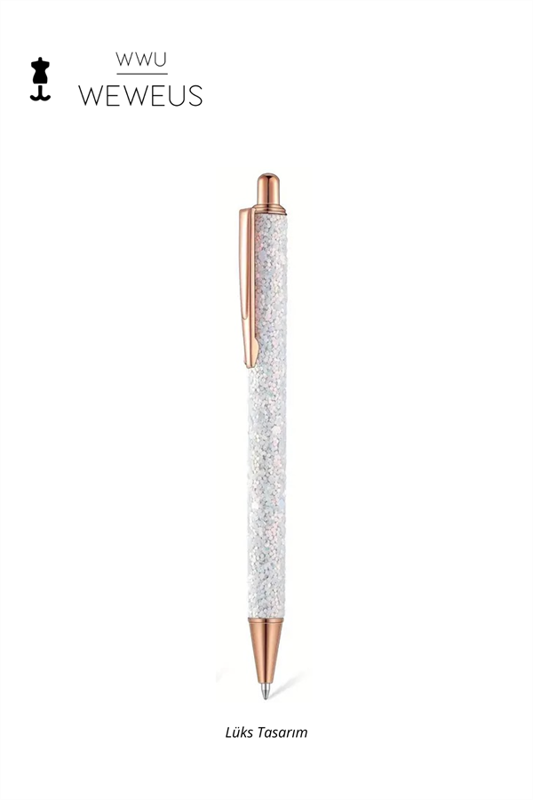WeWeus Beyaz Rose Detaylı Beyaz Simli Lüks Tükenmez Kalem