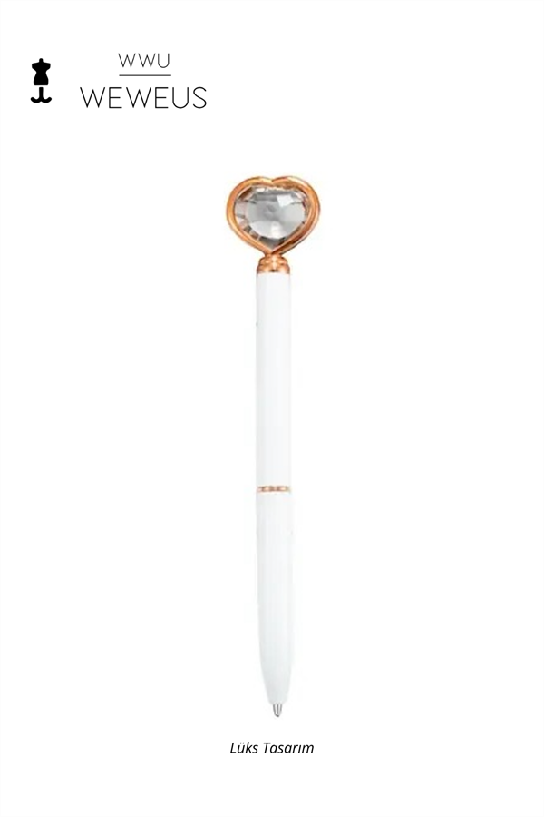 WeWeus Beyaz Rose Detaylı Kristal Kalpli Lüks Tükenmez Kalem